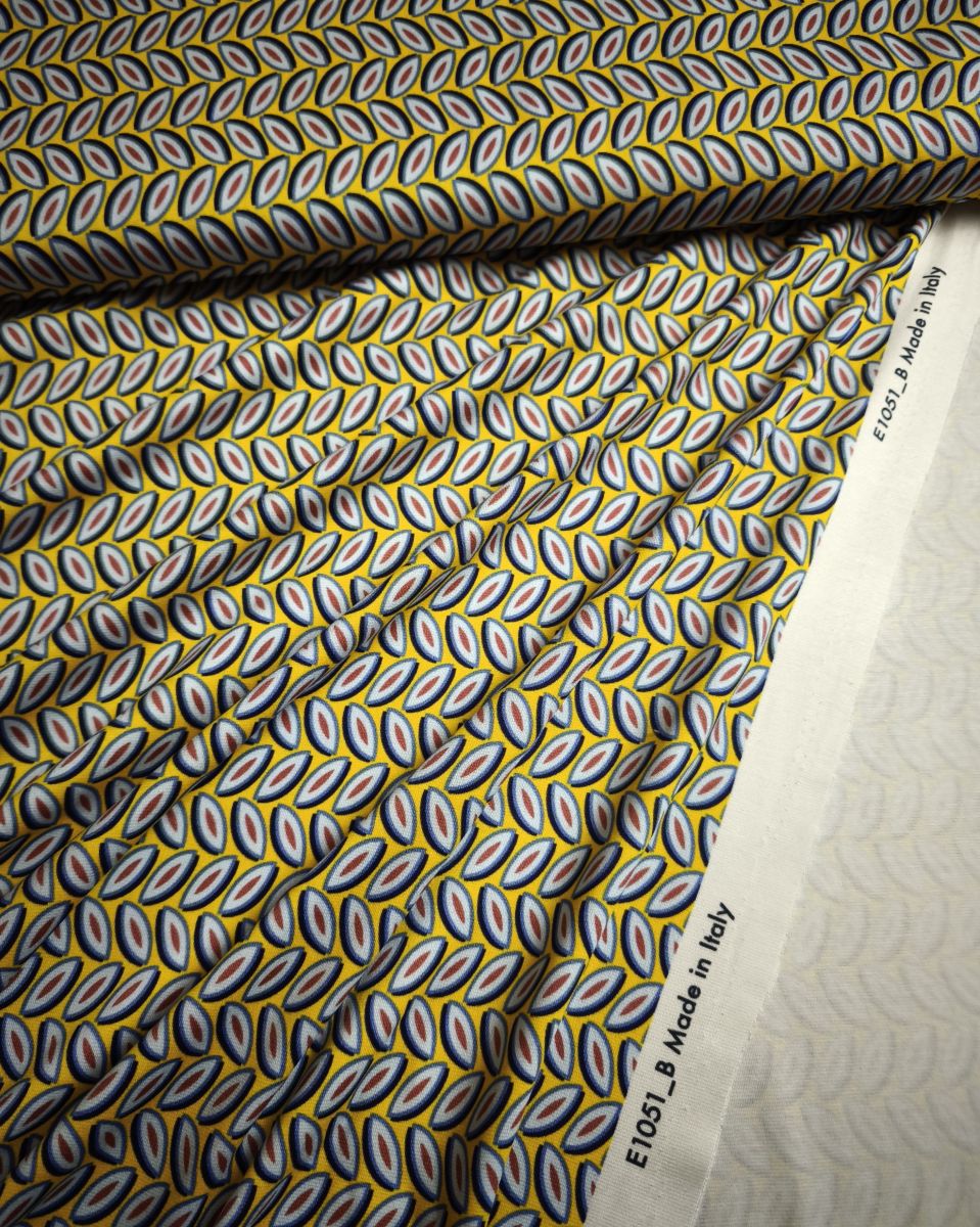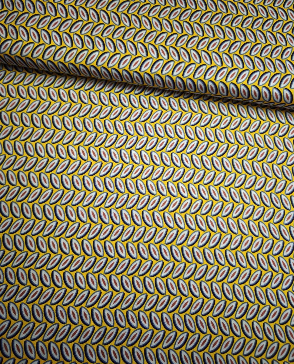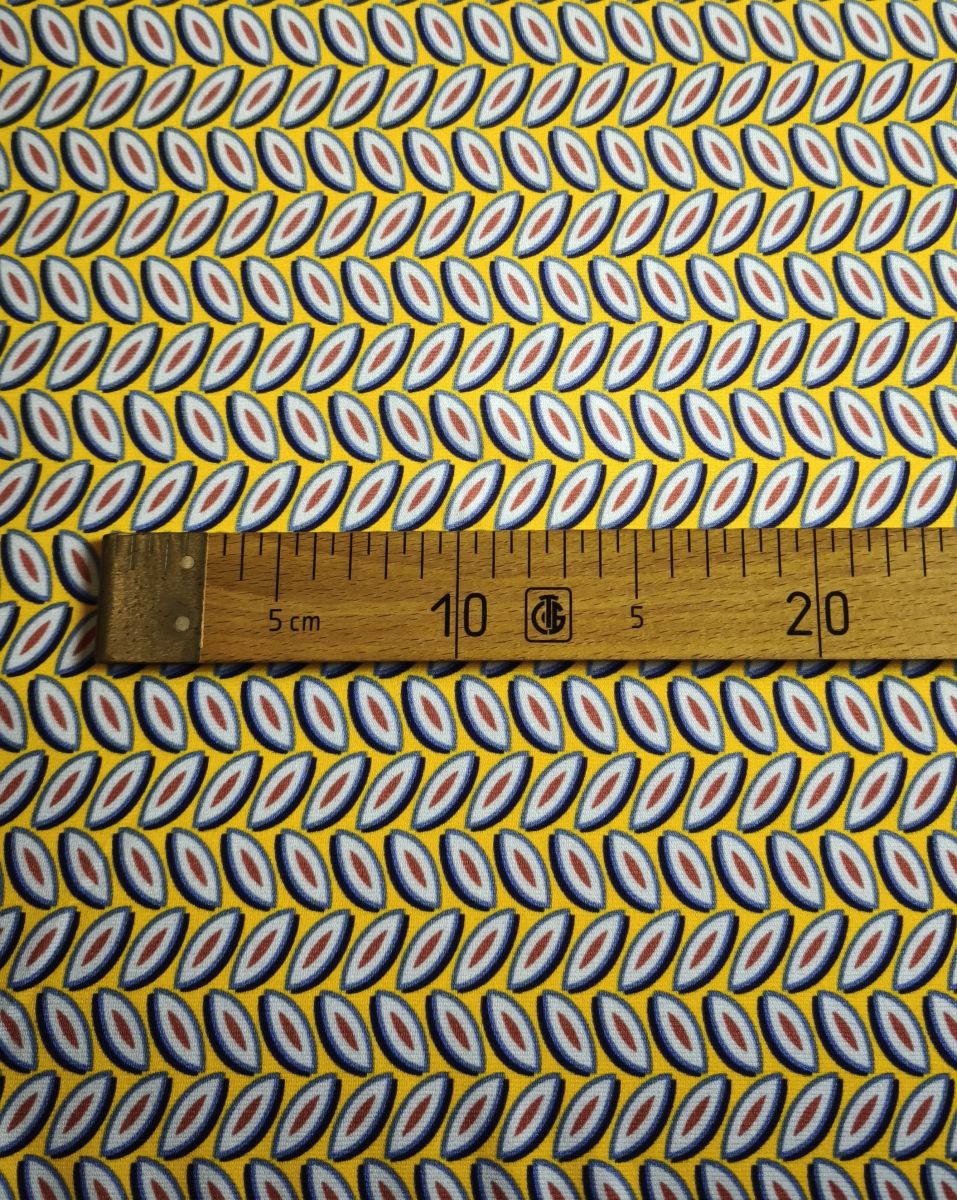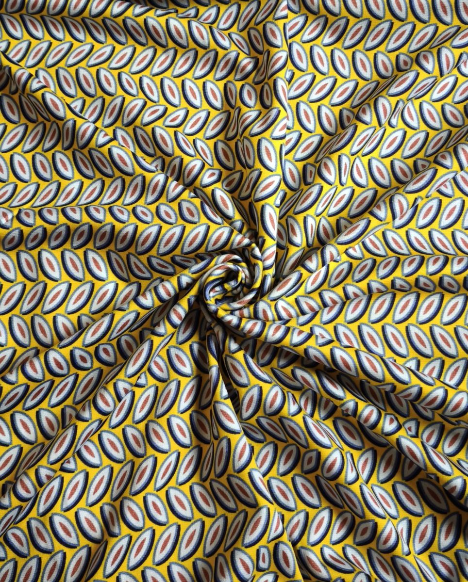 Джерси вискозное желтое с сине-бело-красным принтом.