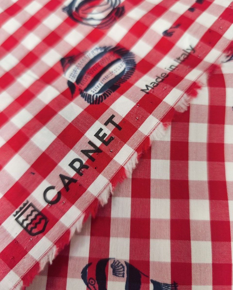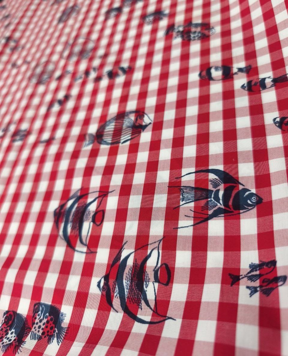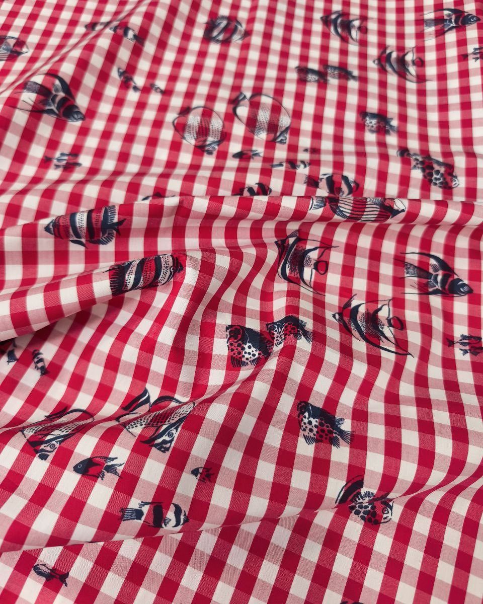 Поплин CARNET красно-белая клетка и рыбки. Ткань тонкая, плотная, упругая, шелковистая тактильно, с незначительной сминаемостью.