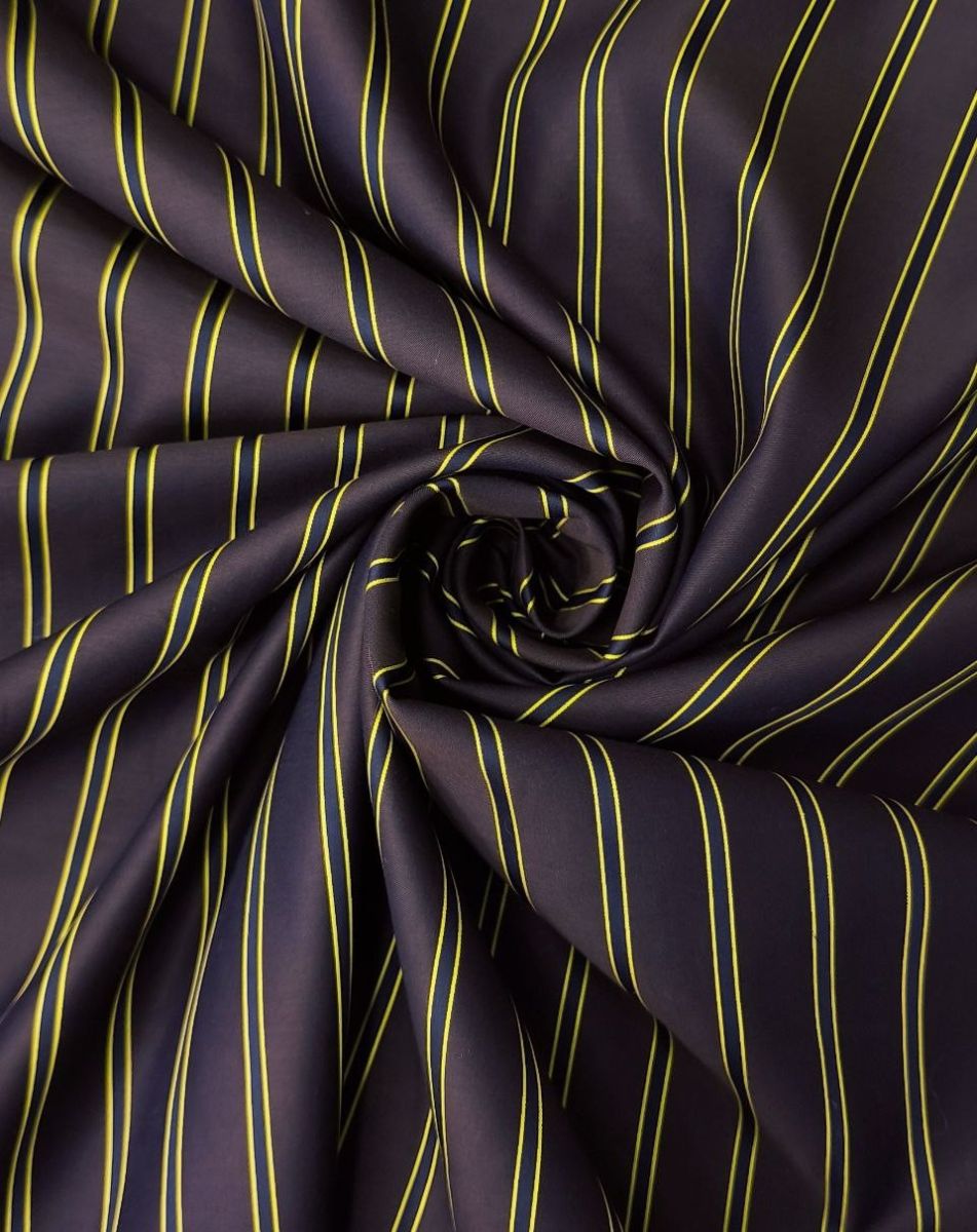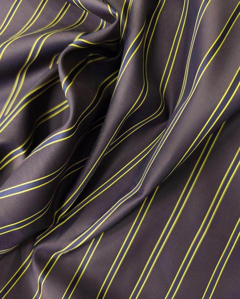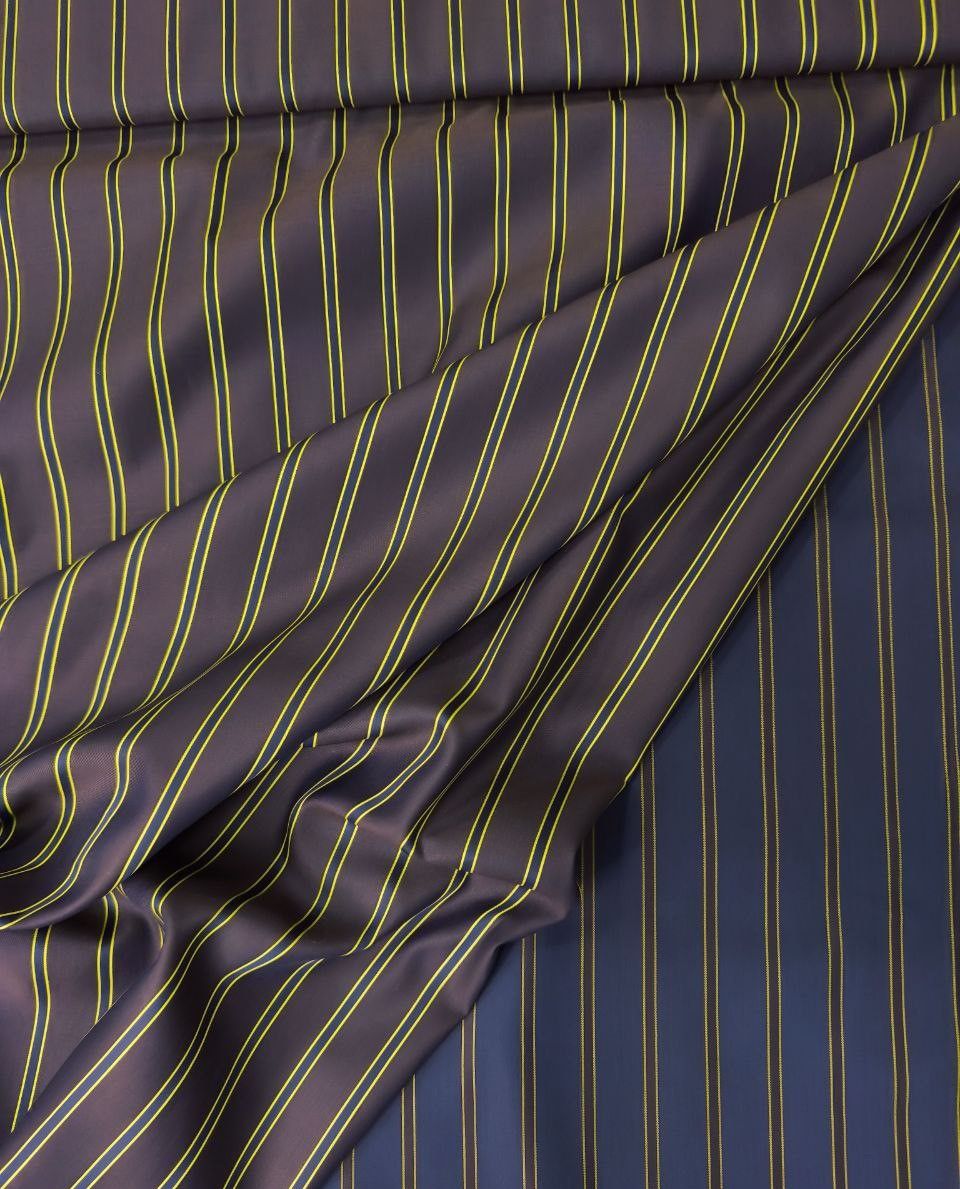Поплин в оттенке итальянской сливы с желтой полосой Ralf Laurent. Ткань средней плотности, упругая, сминаемость незначительная, не просвечивает, с легкой хрустинкой.