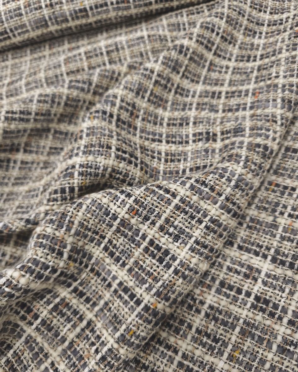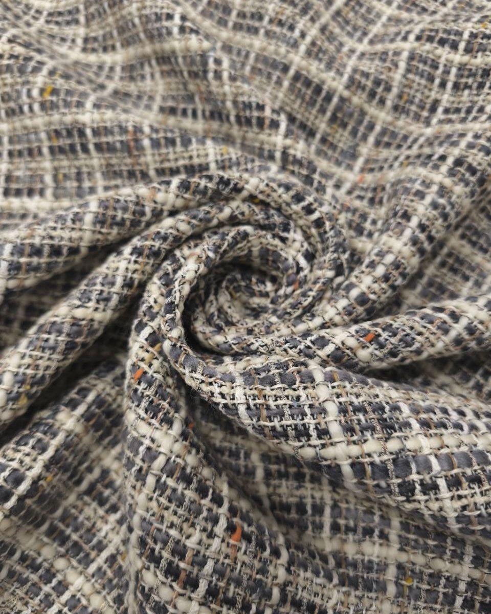 Твид в стиле Шанель серо-бежевый с вкраплениями желтого, оранжевого и кофейного. Ткань пластичная, комфортная.