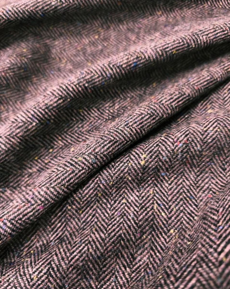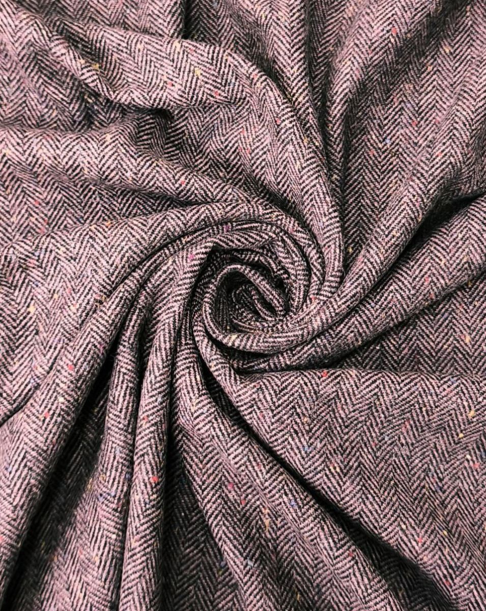 Твид черно-розовый в "елочку" с черными вкраплениями. Ткань теплая, мягкая, пластичная.