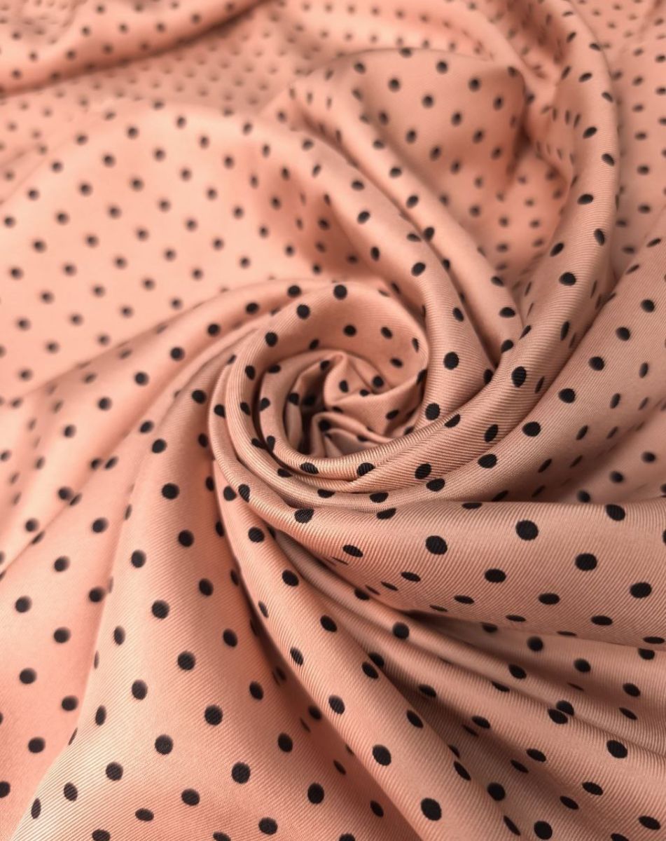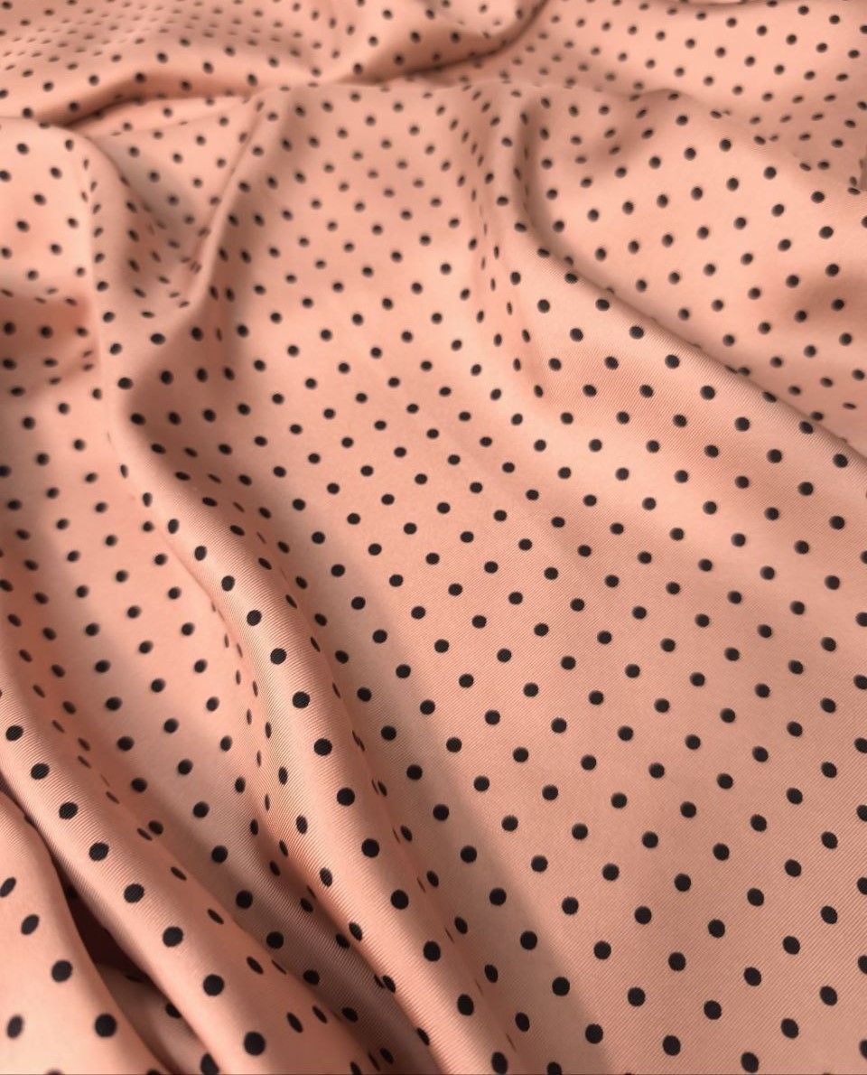 Шелковый твил розовый в горох. Ткань упругая, не мнется, не просвечивает.